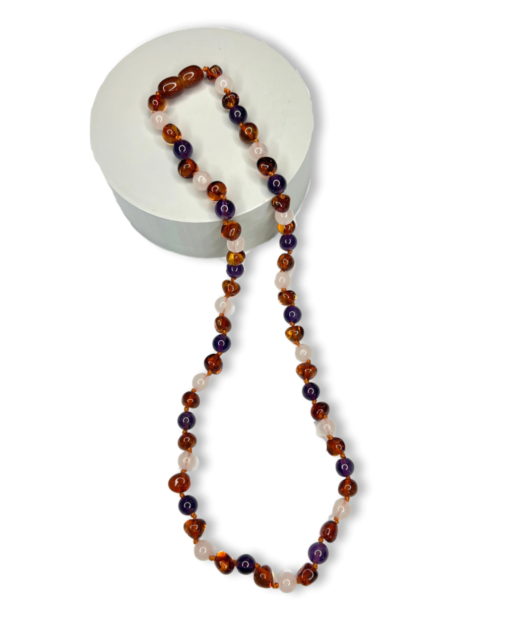 Collar de ámbar con cuarzo rosa y amatista.