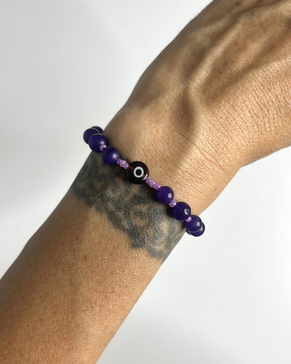 Pulsera elástica de piedras naturales y canutillos con ojo protector central. Apto Agua.