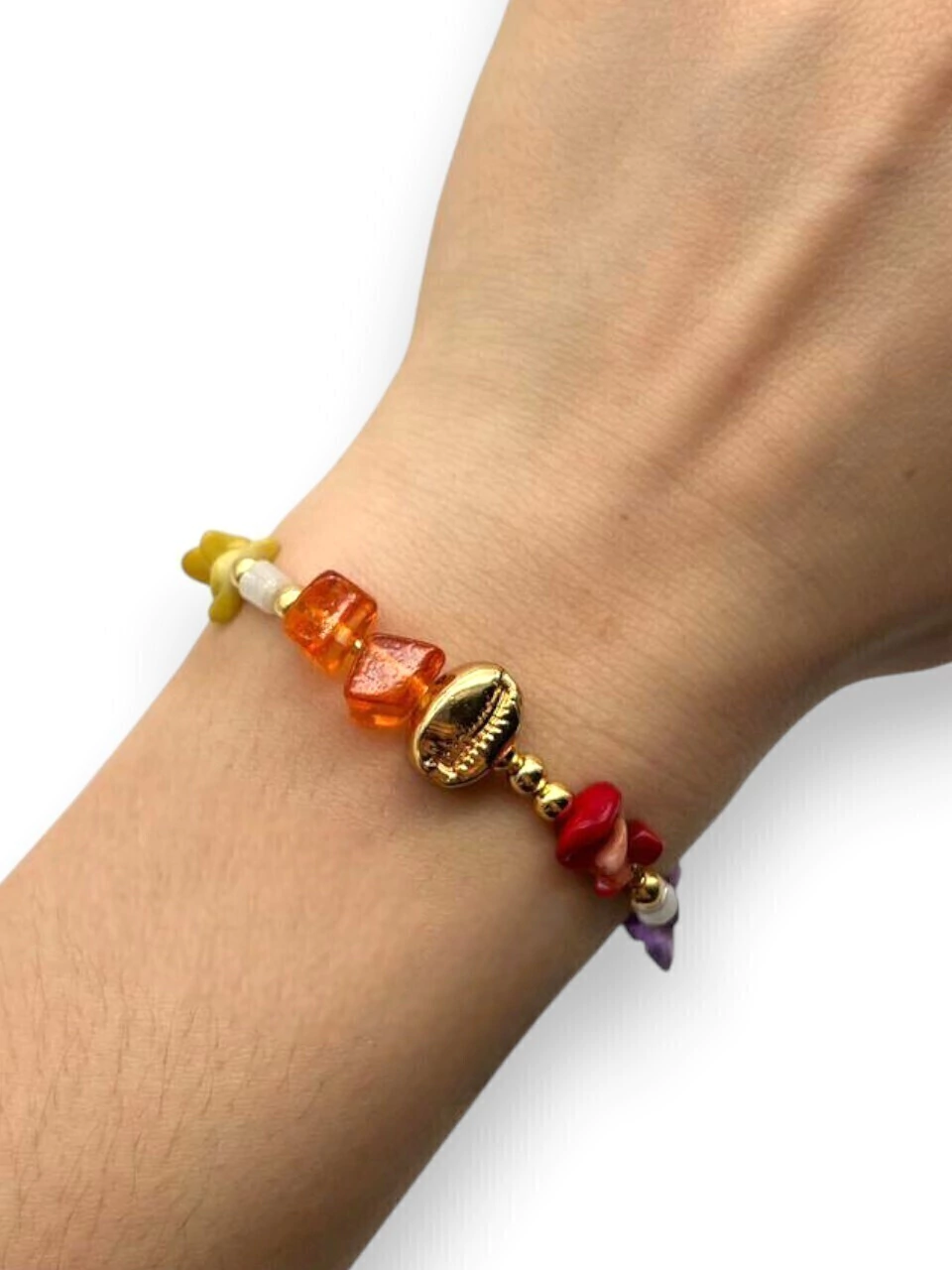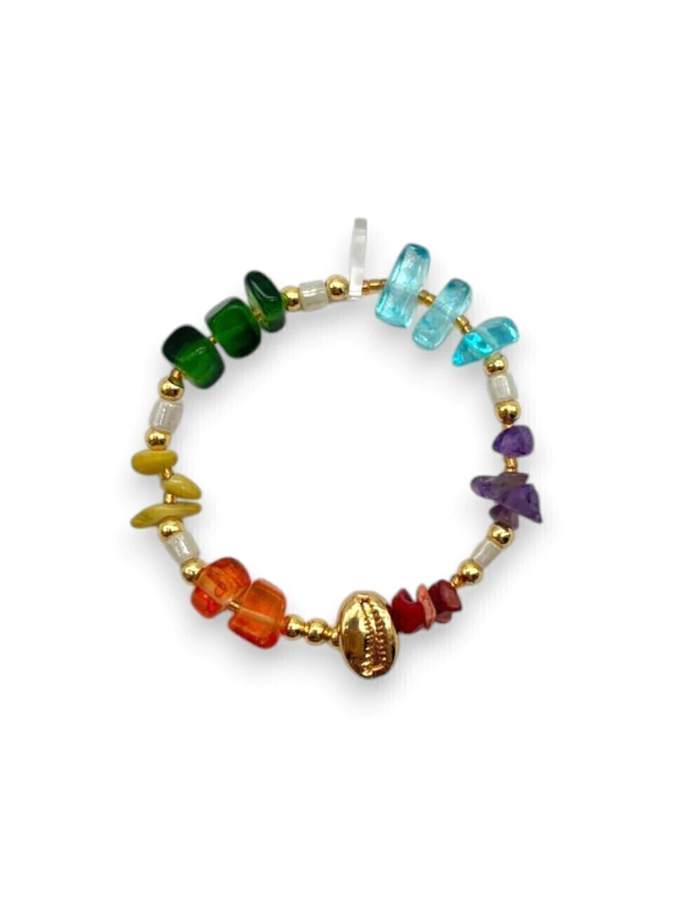 Descubrí la Pulsera Praia, una pieza elástica confeccionada con cuentas de acero bañado en oro, acompañadas de escallas de piedras y un delicado dije de caracol, que aporta un toque único y elegante.