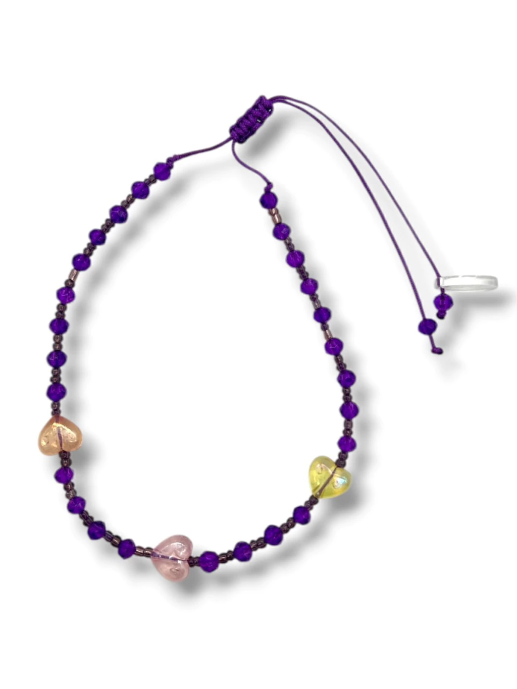 Descubrí esta hermosa tobillera regulable elaborada con cristales y mini mostacillas, que aportan un brillo sutil y sofisticado. Los delicados dijes de resina en forma de corazón le dan un toque único y cálido, ideal para complementar tu estilo diario.